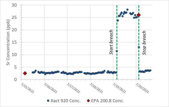 Lastly, a membrane breach was simulated on the CCRO system to evaluate if the Xact 920 could detect such an event. Figure 2 shows the Xact 920 and EPA 200.8 total strontium measurements over time during the breach event. The Xact 920 and EPA 200.8 track very closely during normal operation and under a simulated breach.