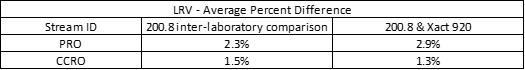 The Xact 920 measurements were compared to laboratory results using EPA 200.8 for both concentration and LRV. Table 2 shows the average percent difference between the Xact 920 and EPA 200.8 for total strontium concentration, during three sampling campaigns. In addition, one inter-laboratory EPA 200.8 comparison was conducted on all four streams to evaluate the variability of EPA 200.8. The Xact 920 had excellent agreement with EPA 200.8 exhibiting similar percent differences as EPA 200.8 has with itself.