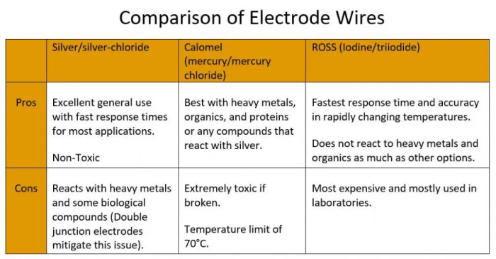 The first potentiometric electrodes used Calomel wires (mercury/mercury chloride) but these have mostly been phased out due to their toxicity. The chart below demonstrates the pros and cons of the different types of wires.