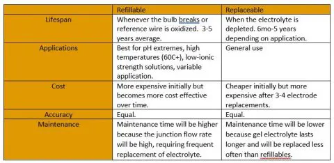 One method is to use refillable electrodes, which have a hole that can be opened or closed to add or change electrolyte as needed. The second method is using replaceable or sealed electrodes, which are often filled with electrolyte gels or polymers instead of solution, giving them a lower flow rate. Typical replaceable electrode life is about 2-3 years but depends heavily on how quickly the reference solution is diluted. They will not need to be replaced as often as refillable electrodes must be refilled so they are considered lower maintenance and are generally cheaper than their refillable counterparts. Accuracy can be as high as ±0.01-0.02 pH for both types so the main reason to use refillable electrodes is for samples at extremes (e.g. above gel/polymer melting point, or in strong acids, bases, or low-ionic strength solutions where dilution occurs rapidly). Be aware that refillable electrodes will also last less time in these extreme situations than it otherwise would because the reference wire will become oxidized over a shorter period.