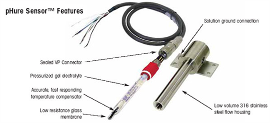 pH of Pure water (even RO permeate) is difficult and requires special probes, procedures, grounding, etc. You need the right probe, and you need conductivity to make the pH probe work well. We recommend MT Thornton “pHure Sensor” which is a grounded, shielded vessel/probe system using a slip-stream with controlled flow. The flow is low, and the measured stream goes to waste. The probe must be one of two special probes for this application.