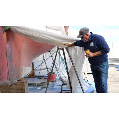 Phil Riise, owner of Seaview Boatyard North in Bellingham, lifts up the tarp on a boat that his team is repairing on Monday, Sept. 27. The tarp and vacuum are part of a broad slew of strategies Seaview Boatyard North uses to comply with state stormwater regulations. YSABELLE KEMPE THE BELLINGHAM HERALD