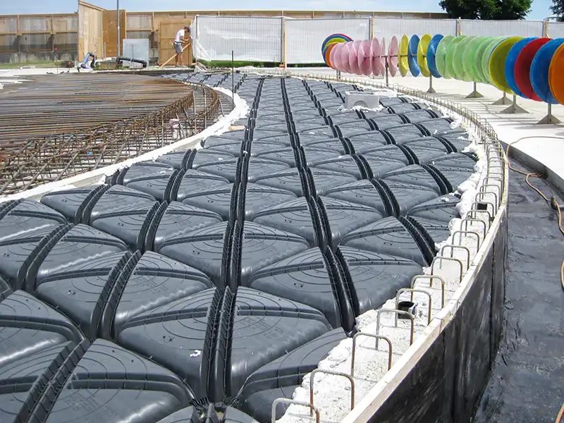 - Minimum use of concrete for level filling thanks to the lowered dome form, which permits maximum resistance with minimum slab thickness.