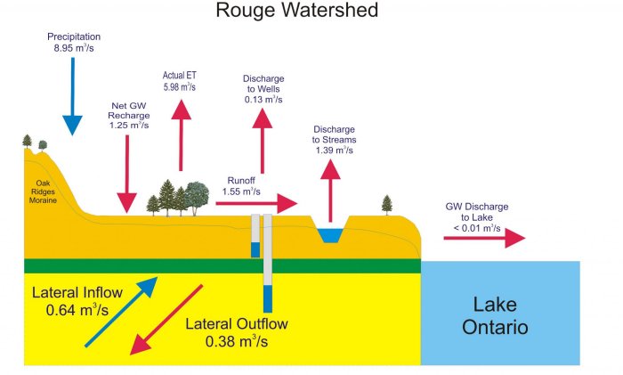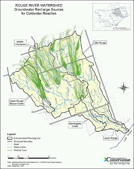 Building on earlier work on the Oak Ridges Moraine, Earthfx worked with the Toronto and Region Conservation Authority (TRCA) to develop key surface water and groundwater components of the Rough River Watershed Plan. Earthfx tasks included surface water modelling, land development impact assessment, climate change, and groundwater model simulations of the watershed. A surface water model was developed using the WABAS model, which Earthfx converted and applied in a fully distributed form for this study. Model simulations were used to evaluate changes in recharge and runoff patterns in the watershed due to land development and climate change. Sustainable Community scenarios included simulation of recharge enhancement due to pervious pavement, roof water management and other Low Impact Development (LID) practices. Recharge estimates were applied to a USGS MODFLOW groundwater model to evaluate long term changes in groundwater levels under a variety of scenarios, and particle tracking simulations from high discharge reaches were used to understand groundwater flow pathways. Finally, the coupled SW and GW models were used to estimate all major components of the watershed water budget.