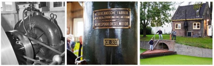 The best hidden monument in Alkmaar lies between the modern houses; the picturesque J. Leegwater pumping station. The name pays tribute to the Leegwater family, who for three generations worked passionately on the pumping station. The pumping station has a centrifugal pump with a capacity of 33 m3/min and bears the name of the Werkspoor brand (this was the largest machine factory in the Netherlands during the 1850s). This pump is powered by a MAN single-cylinder diesel engine with an output of around 25 hp. The engine with the construction number 320 comes from a series on which the inventor Rudolf Diesel had personally worked on. The centrifugal pump is supported by a Stork cooling water pump and a Jaffa vacuum pump that, according to the son of the last operator, was last overhauled in 1968.