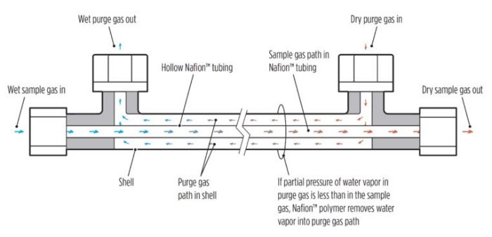 A purge gas is a dry, clean gas that is directed through the purge gas pathway of Perma Pure dryers, countercurrent to the flow of the sample gas through the Nafion tubing. It is important that the purge gas is drier than the sample gas: when the partial pressure of water vapor in the purge gas is less than the sample gas, Nafion™ polymer removes water vapor from the sample path into the purge gas path.