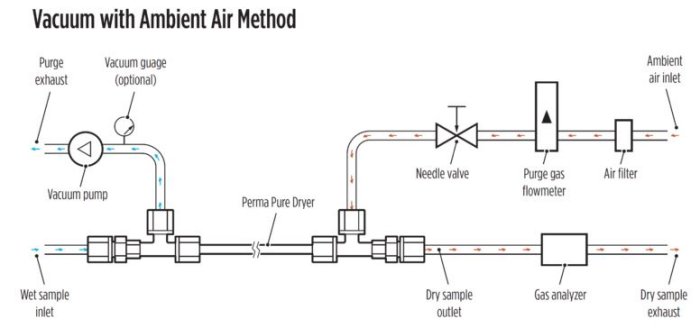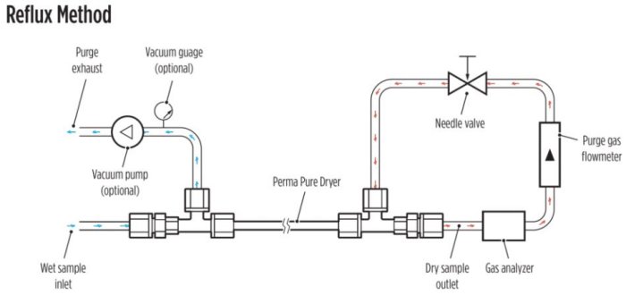 - Vacuum with dry analyzer exhaust (Reflux Method) – the dry exhaust from the gas analyzer is pulled through the purge gas flow path by vacuum. In this case, the sample and purge gas flow rates (mass flow) are the same and all of the sample gas is used as purge. Every combination of sample and purge gas flow rate, dryer choice, and vacuum pump choice will affect performance and will need to be tuned to find the parameters yielding optimal performance.