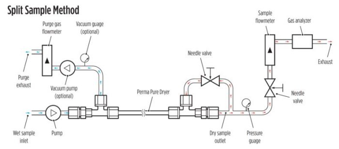 - Vacuum with recycled dry sample gas (Split Sample Method) – a percentage of the dried sample gas, pulled through the purge gas flow path by vacuum, can serve as a purge gas source. In this case, different combinations of sample and purge gas flow rate, percent sample gas used as purge gas, dryer choice, and vacuum pump choice will affect performance and will need to be tuned to find the parameters yielding optimal performance.