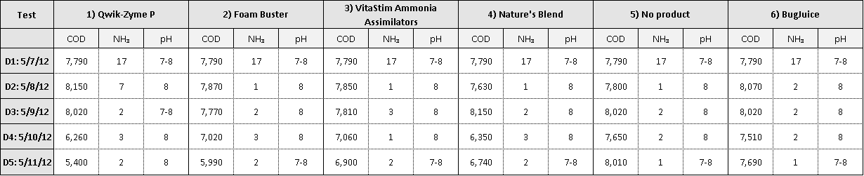 - Adding 20ppm of Qwik-Zyme P or Foam Buster after every day for 5 days seemed to reduce COD and NH3 further than the other products tested and the control.