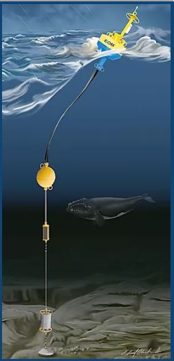 Using EOM Offshore’s patented mooring technology, an array of 10 passive acoustic moorings were custom built to listen uninterruptedly for the endangered Northern Right Whale. The up-calls detected from the Northern Right Whale are sent near real-time via satellite for analysis at Cornell’s Laboratory of Ornithology as part of the Bioacoustics Research Program. In this application, the electromechanical chain, stretch hose, and anchor recovery system are key components to the mooring. EOM Offshore’s stretch hose technology has operated in extremely rough sea states, without a disruption in data transmission and power supply. The “stretchability” of the stretch hose also improves data quality, because it decouples the wave energy from the hydrophone that sits below the subsurface sphere. In addition, the EM Chain sits below the subsurface sphere supporting the hydrophone and improving data quality. Massachusetts has strict permitting laws that require permittees to retrieve all equipment from the ocean. EOM Offshore’s anchor recovery system allows Excelerate Energy to meet this requirement.