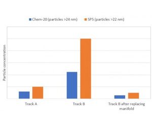 Both the Chem 20 chemical particle counter and SP5 analysis measured a significantly higher number of particle counts at Track B than at Track A. After some troubleshooting, an aging manifold block within Track B was replaced and the measurement repeated. The particle concentration decreased by one order of magnitude (lower than Track A) after replacing the manifold block. The Chem 20 particle counter measurements were consistent with the SP5 wafer scanning results. The SP5 tests detected a higher number of particles during each test, since the number of smaller particles included was higher.