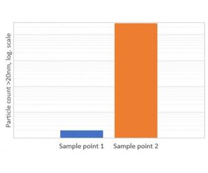 The particle concentration measured at Sample point 1 was very low, as would be expected immediately downstream from a 5 nm filter. However, the particle concentration at Sample point 2 increased by several orders of magnitude, indicating this tool was shedding particles even after ten hours of flushing. For tool manufacturers that flush until their requirements are met, the Chem 20 chemical particle counter can check particle qualifications in real-time.