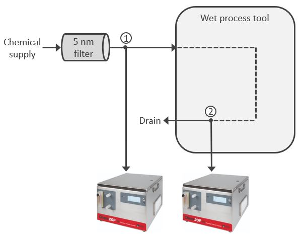 - The fluid going into the wet process tool (Sample point 1), which is filtered immediately upstream to 5 nm.