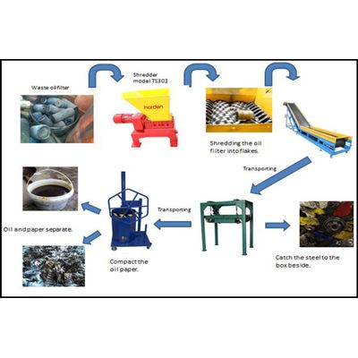 Oil filter recycling line’ s basic concept is to shred the oil filter to small flakes, then magnetically remove the clean metal, collect the oil paper and loose the filter media with a capture design for collecting the loose oil. HARDEN designs and constructs small oil filter recycling line to meet the request of oil filter recycling.
