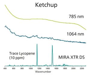 Measurement of analytes in ketchup is a particularly interesting application, as it is a highly colored, complex mixture. With 785 nm testing, it shows fluorescence—with 1064 nm testing, it burns. But XTR analysis carries the added benefit of signal enhancement, returning a spectrum that clearly indicates the presence of trace lycopene in ketchup—the chemical that contributes its red color (Figure 5).