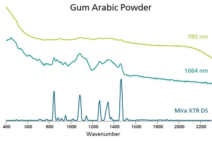 Figure 1 contains Raman spectra from a fluorescent material, Gum Arabic powder, with traditional 785 nm and 1064 nm laser excitation, in addition to MIRA XTR DS. The improvement in resolution with XTR is obvious. Notice the very flat (uncorrected) baseline in the XTR spectrum on the bottom. This is crucial for library matching with a Pearson correlation, where the dot product between spectra and non-zero baselines contribute strongly to the correlation.