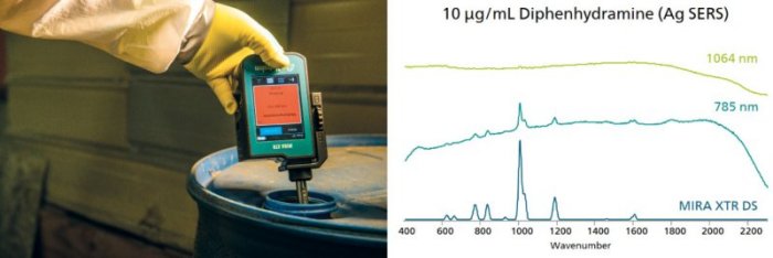 Diphenhydramine is another example of a common OTC drug that, when detected, may suggest darker dealings. It can be abused on its own, but it is also a potential precursor in the synthesis of methamphetamine. Diphenhydramine exhibits some fluorescence when interrogated with 785 nm Raman (Figure 3), but it is also typically present in mixtures with inert ingredients that fluoresce. For this type of analysis, SERS can be used to detect trace amounts of a substance. This is an excellent showcase for MIRA XTR DS, because it can perform both 785 nm Raman and SERS tests, while most 1064 nm systems currently on the market cannot be used for SERS analysis.