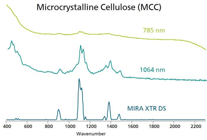 Microcrystalline cellulose (MCC) is another inert excipient that is commonly used in food production and the pharmaceutical industry. When interrogated with 785 nm Raman, its fluorescence can overwhelm the Raman signal and prevent identification and mixture matching (Figure 4).