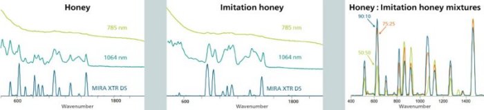 Another important application demonstrates how MIRA XTR DS can distinguish imitation honey from the pure, unadulterated form in the pursuit of fraudulent food products, and that it shows promise for quantitative analysis. MIRA XTR DS extracts Raman spectra from materials that typically show fluorescence with 785 nm excitation, this time with sufficient resolution to detect different ratios of mixtures (Figure 6).