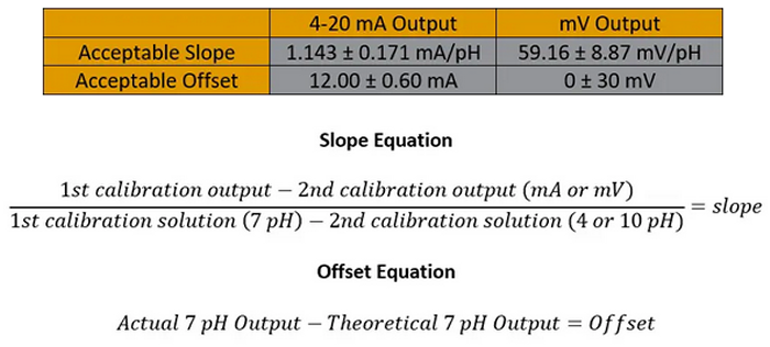 Step 3. Calculate Slope and OffsetUse the following information to determine if the electrode is in acceptable range (These are pHionics guidelines based on calibration at 25°C and may not be the same for other manufacturers):