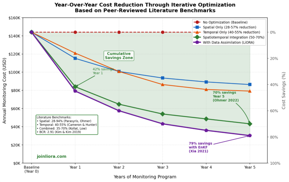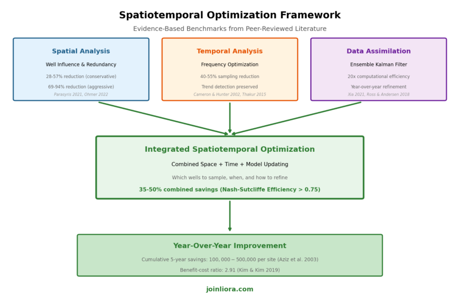 Key Takeaway: Spatial optimization achieves 30 to 40 percent well reduction at contaminated sites. Temporal optimization achieves 40 to 55 percent sampling reduction. Combined approaches routinely achieve 35 to 50 percent total savings while maintaining equivalent data quality for decision-making.