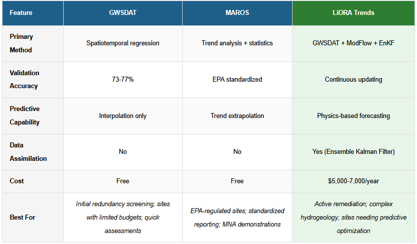 Key Takeaway: Start with free tools (GWSDAT, MAROS) for initial analysis to identify obvious optimization opportunities. Consider LiORA when predictive capability, continuous optimization, and integration with numerical modeling matter for long-term site management.