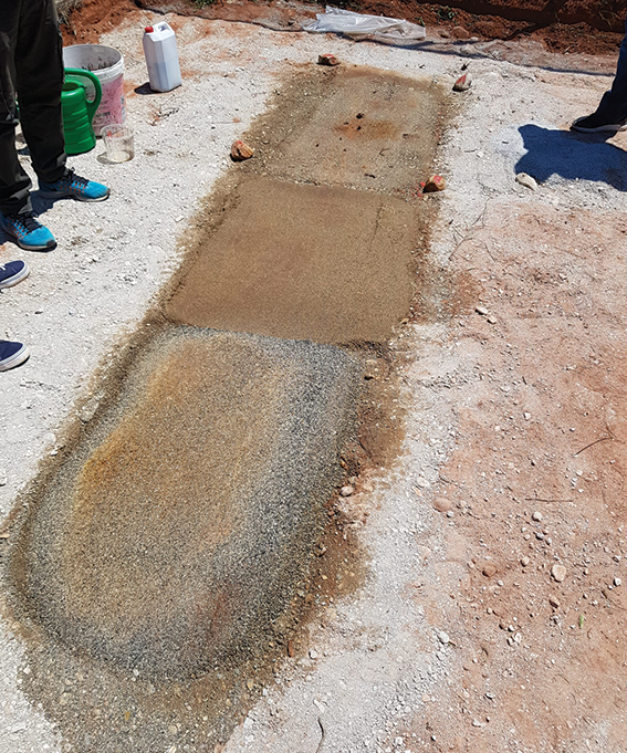 The center image in the below gallery shows the small-scale testing with the suggested materials for the top layer: 3A natural gravel-sand mixture at the edge, natural river sand in the middle and 0-10mm crushed rock from the quarry (the grey section seen in the picture). These materials were analyzed for their bonding capabilities with DUST/BLOKR® /SB and their overall suitability for the project.