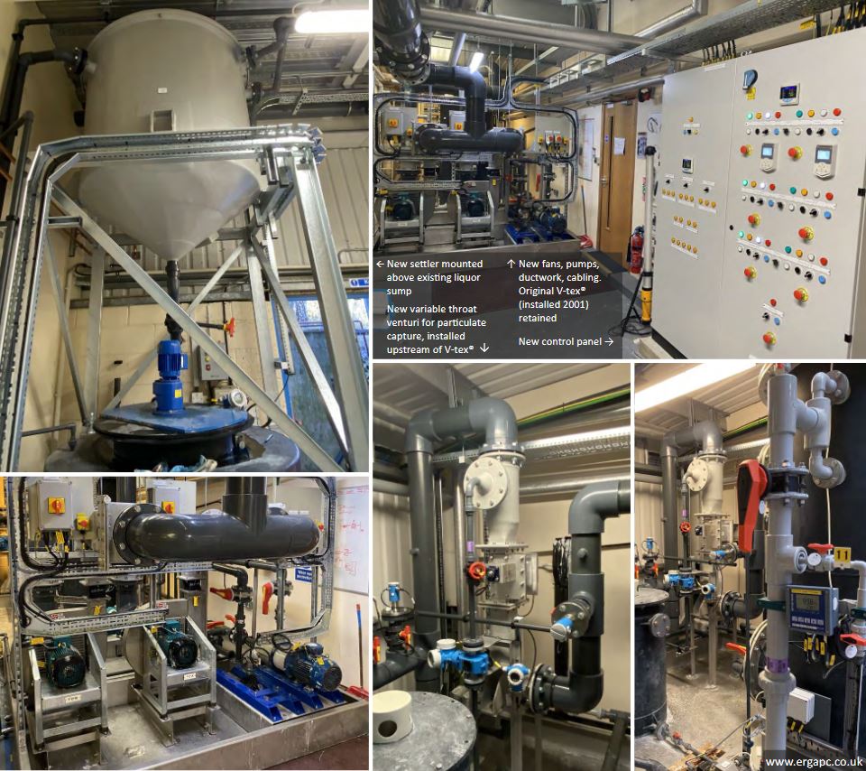 - New venturi scrubber, recirc pumps, fans, ductwork, solids settler, pipework, instruments, control panel
