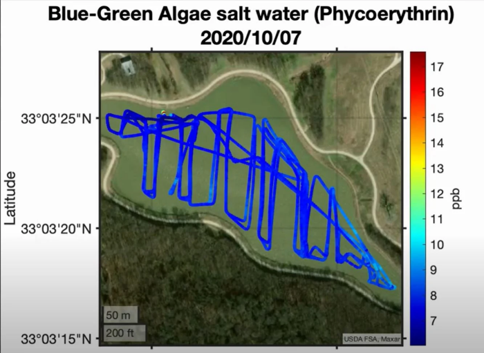 In addition to robotic equipment used from air and land, the UT team is using autonomous boats to determine water quality. Three Eureka Manta probes were placed under the boat that gathers important information such as temperature, turbidity, conductivity, and aquatic vegetation. The probes provide valuable, real-time information which would prove vital in rapidly addressing water conditions.