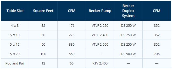 Available in a range of sizes, Becker’s router table pumps start at 1 horsepower and move up to 25 horsepower; for more demanding applications, our unique multi-pump systems can achieve an impressive 75 horsepower.