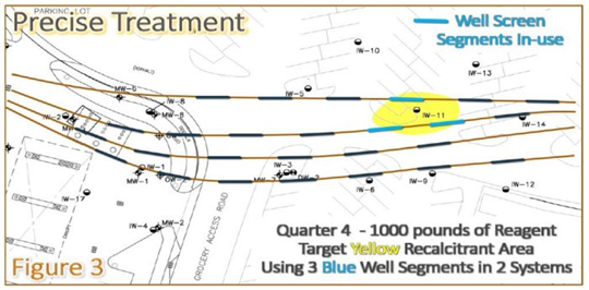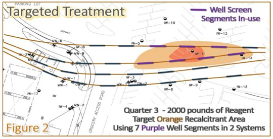 The third quarter polish addressed the two remaining recalcitrant wells (orange shaded area). After sampling, one recalcitrant well remained which was addressed during the final quarter polish. (Figure 2, purple segments used for injection).