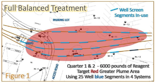 The full scale implementation was completed in February 2015 with Vertebrae and injection. An automated injection system injected 3,000 pounds of activated reagent over 45 days of injection per quarter. Twenty five injection segments (500 feet total of well screens) were adjusted to target areas based on feedback data.