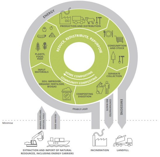 The collection, processing and use of the end products (compost and biogas) of organic waste is a practical example of circular economy.