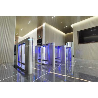 A glass turnstile is a type of physical security barrier that is used to control access to an area. It is usually placed at the entrance to a building or a restricted area within a building. The turnstile is designed to allow one person to pass through at a time. It is usually made of glass or metal and has a rotating arm or barrier that is controlled by a motor. When the turnstile is not in use, the arm or barrier is in the closed position and blocks the entrance. When someone wants to pass through the turnstile, they must insert a key, card, or token into a reader that is attached to the turnstile. This activates the motor, which rotates the arm or barrier to the open position. The person can then pass through the turnstile. Once the person has passed through, the arm or barrier is automatically rotated back to the closed position.