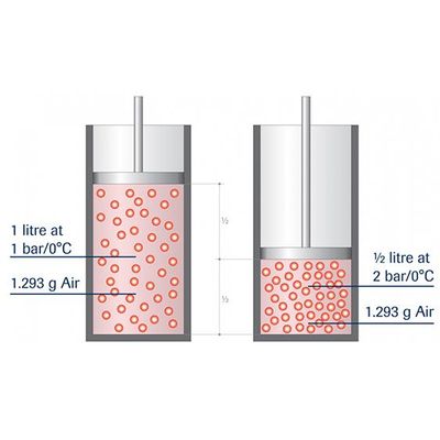 The weight of this volume of air at 0°C is 1.293 g, this is the mass. When we move the piston half way to the bottom of the cylinder, then the contained volume of air is only ½ litre, the pressure is approx. 2 bar, but the mass is unchanged, 1.293 g; nothing has been added, or left out.
