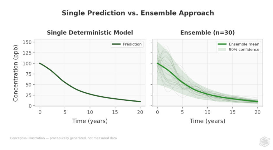 "The plume will reach the property boundary in 12 years" sounds actionable. But it hides the question that actually drives capital planning and regulatory negotiation: what is the confidence level of that assessment?