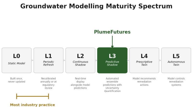 The tools required to reach Level 3 already exist and are free. MODFLOW6, the USGS groundwater simulation standard accepted by regulators across North America, has been open source since the 1980s.(7) PEST++, the parameter estimation software that enables ensemble-based calibration, is also free and open source. The barrier is not technology. It is operational: nobody has automated the pipeline that turns raw site data into a calibrated, uncertainty-quantified groundwater model and keeps it current as new data arrives.
