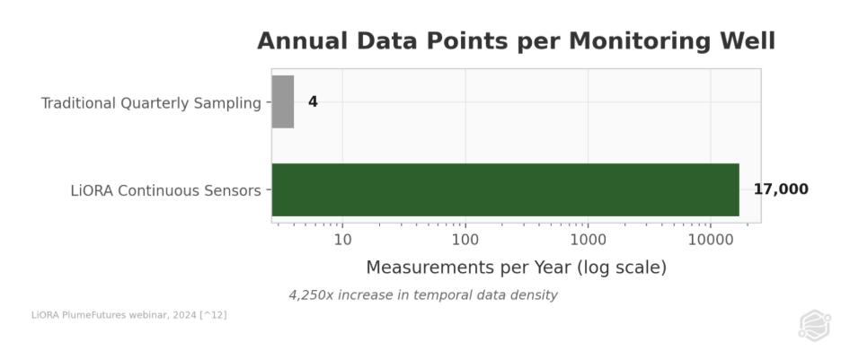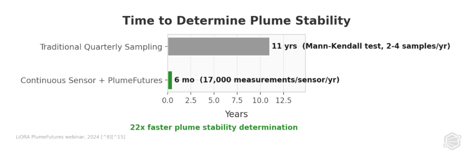 Continuous sensor data changes this math entirely. LiORA`s NDIR (Non-Dispersive Infrared) subsurface gas sensors produce approximately 17,000 measurements per sensor per year, sampling every 30 minutes.(8) Across a 40-sensor network, that equals 680,000 data points annually versus 160 from quarterly sampling at the same site. With that data density feeding an automated groundwater model, plume stability can be determined within approximately six months rather than ten to twelve years.(8)