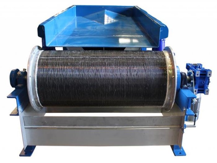 The increased magnetic intensity of the Wire Wrapped Drum Magnet enables the separation of fine iron and weakly or para magnetic particles and minerals as found in non-metallic mineral deposits such as silica sand, chromite in foundry sands, abrasives such as corundum and alumina, and for recycling applications. The optimum particle size of the fine granular material is between 70µ and 2mm.