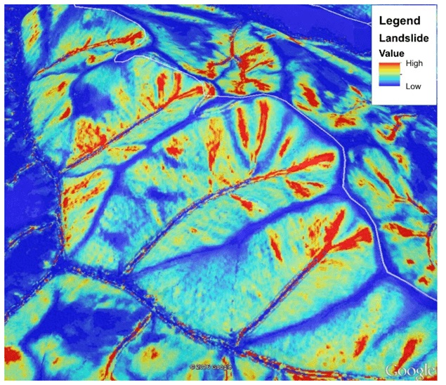 One example of such a deliverable is a digital elevation model. A digital elevation model uses only the ground classified points to provide a smooth bare earth elevation model. These are often used in hydrologic modeling, terrain stability, and soil mapping. In hydrology, DEMs are essential for coastal hydrologic modeling applications as they help delineate watersheds and calculate flow accumulation and direction. DEMs are also great ways to model terrain stability and allow the user to predict landslides, as shown in the figure below. [5]
