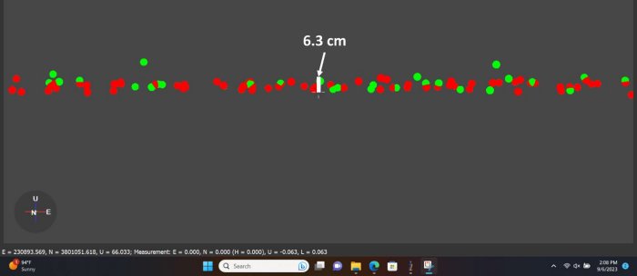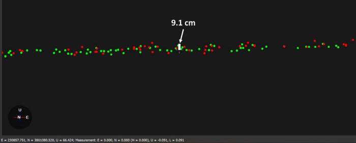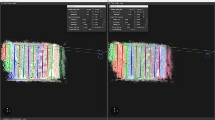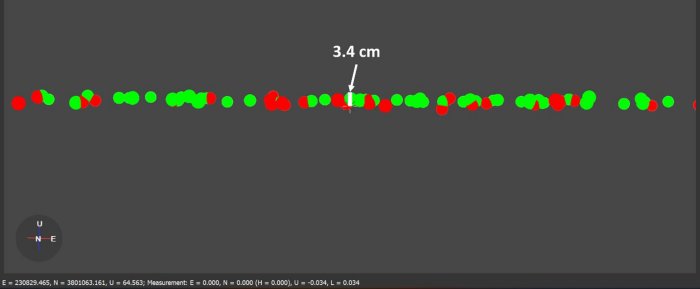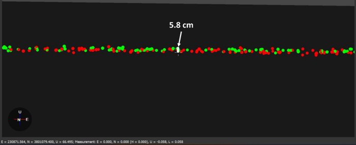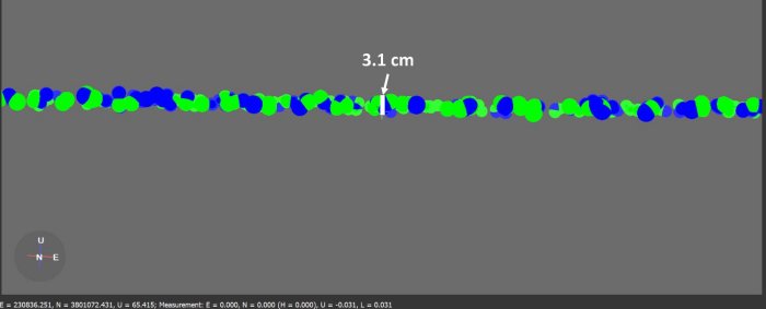 The first accuracy parameter that was examined was relative vertical accuracy. This was done by taking data from 2 parallel passes and comparing a slice of the overlapping section. Datapoints are colored based on selection, so what points came from what selection will be evident. An example of this parallel pass method at 50 meters AGL is shown in the figure below.