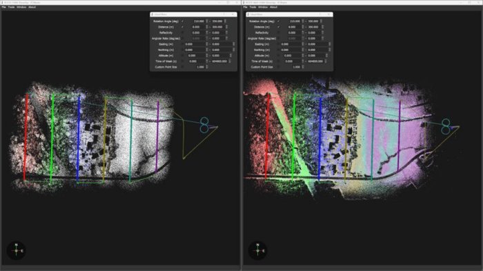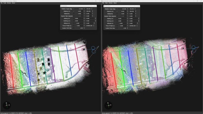 With fewer passes at a fixed 120-degree field-of-view, it is easier to see the overlap of each successive pass in the flight as the height AGL increases. With features like heavy vegetation, power lines, and buildings, this environment is a phenomenal place to examine many aspects of the performance of each payload.