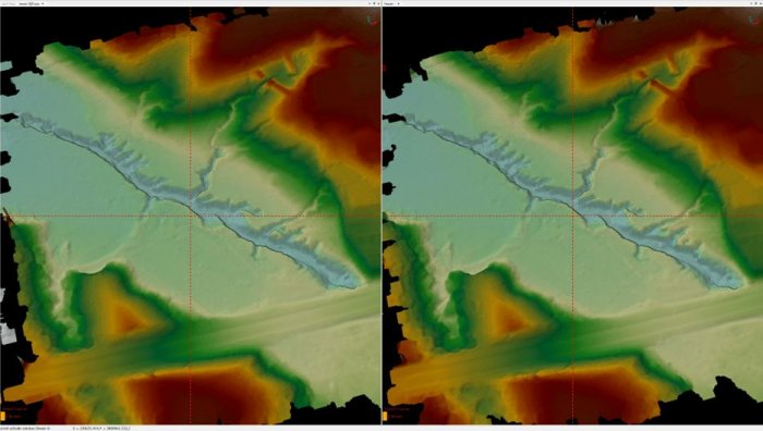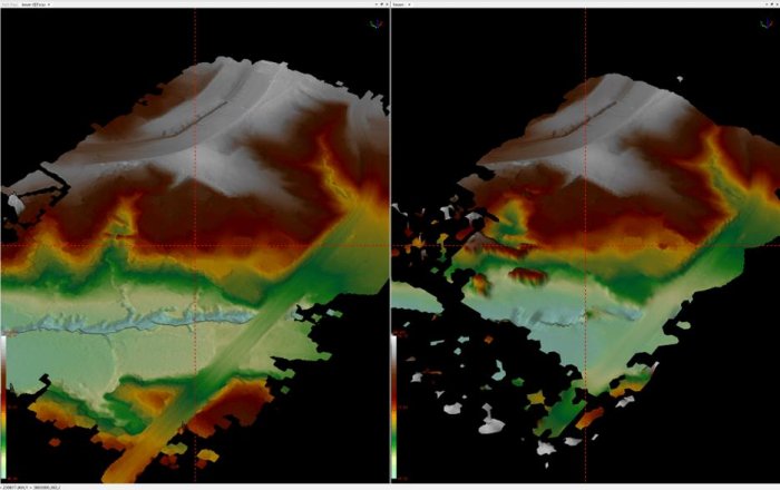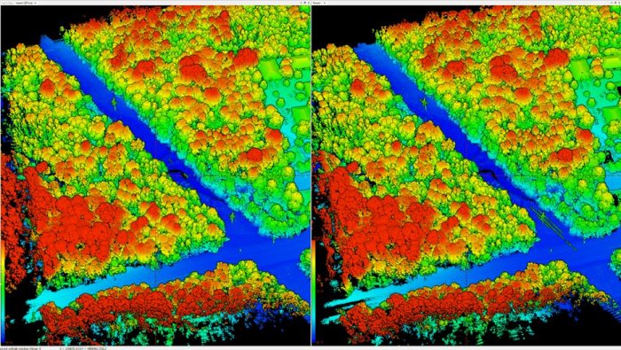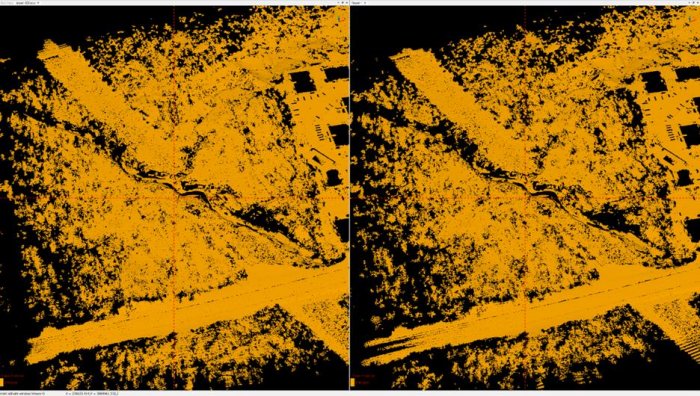 Despite heavy vegetation, these scanners performed exceptionally well to penetrate the ground, even at 100m AGL. Upon inspection, both scanners are highly comparable in this facet, with the M2X having an edge in point density. They also allow us to get a surface model of the cloud in this view, as shown in Figure 10 below.