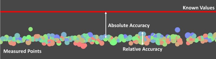 In the remote sensing industry, many different terms get thrown around about accuracy. In general, any accuracy specification can fall under either relative accuracy or absolute accuracy. In the context of a complete LiDAR payload, relative accuracy measures the accuracy between points relative to each other within a single project. Absolute accuracy measures how close a measured value is to a known, surveyed location (actual value) in a geographic coordinate system. An example of how relative accuracy and absolute accuracy are measured is shown in the figure below. This is an important distinction when analyzing the quality of LiDAR remote sensing solutions, as these values speak to the quality of different components of the remote sensing payload. Relative accuracy is more dependent on the LiDAR scanner, while absolute accuracy is more dependent on the quality of the inertial navigation systems (INS) on board. Both parameters are essential for surveying applications to get the job done correctly.
