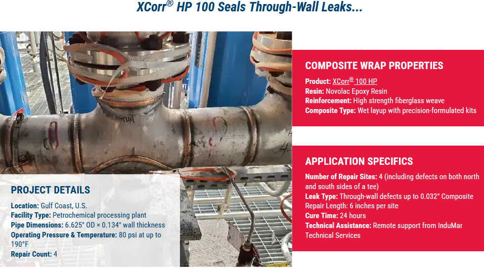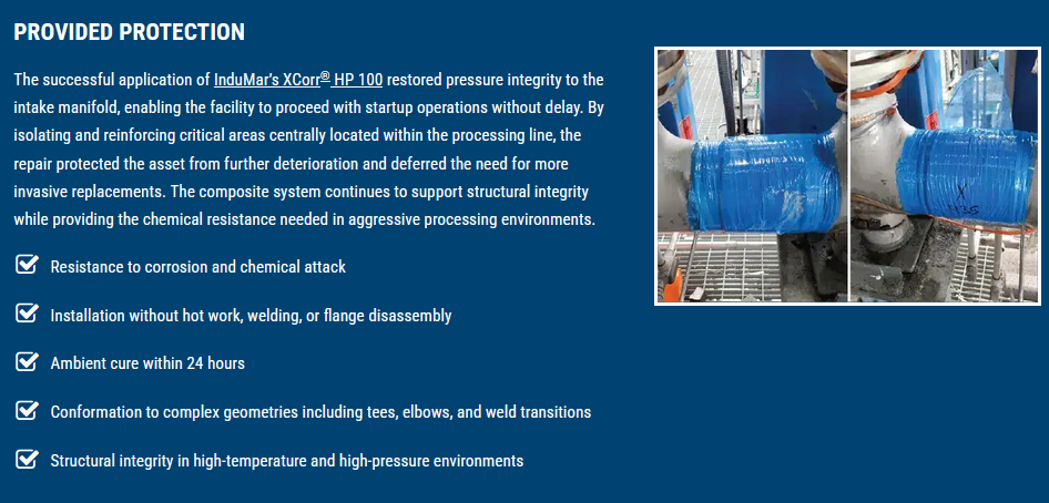 During pre-startup testing at a petrochemical facility along the Gulf Coast, operators identified multiple leaks in a 6" stainless steel raw material intake manifold. The defects-located along the pipe body and in the heat-affected zones of tee welds-were determined to be the result of stainless steel cracking. With commissioning imminent, the asset owner required an immediate, non-invasive solution that could deliver mechanical reinforcement, chemical resistance, and leak sealing under pressure. InduMar`s XCorr HP 100 was selected due to its field-proven performance in chemical processing environments, rapid installation characteristics, and ability to restore pipeline integrity without hot work.