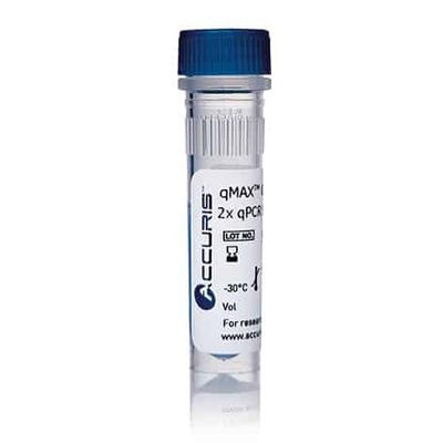 Supplied as a ready-to-use 2X master mix, qMax Green has been engineered for high sensitivity, fact cycling and excellent reproducibility. Accuris Hot Start Polymerase provides accurate PCR of a variety of templates including low copy number and difficult sequences, while the proprietary qMax Green intercalating dye exhibits higher fluorescence and lower PCR inhibition than other popular green dyes. These two components are supported by a specially formulated buffer with an exacting combination of salts, PCR enhancers, stabilizers and pH that results in earlier Ct values and a high specificity across a broad dynamic range. An inert blue dye is also mixed into the qMAX Green to allow easy visualization during pipetting.