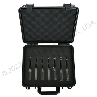 A collection of seven different sized sampling nozzles in one kit. The point at which the sampling gas enters the sampling train and the part of the sampling train which enters the smoke-stack/chimney. Ideally, the sampled gas should have the same velocity as the flue gas inside the stack (Isokinetic sampling ratio = 100%). This means that the nozzle size you use is determined by the velocity of the smoke-stack gas. Figure D.1, Annex D, ISO 9096:2003(E) is a good illustration of this.