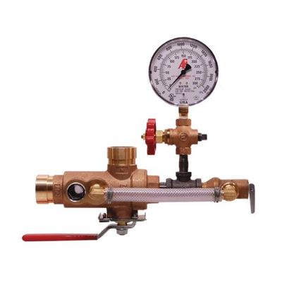 AGF’s TESTanDRAIN Model 2511T is a 300 PSI rated single-handed ball valve designed to provide both the test and express drain functions for a wet fire sprinkler system. It saves time, space, and money by eliminating the numerous connections required by the traditional assembly loop. Model 2511T features a tamper-resistant test orifice and sight glass, a tapped port for system access, a pressure relief valve, 3-way globe valve, and pressure gauge. It's available in multiple sizes with NPT Thread x Thread or Groove x Groove connections. FM approved & UL listed. Made in America.TESTanDRAIN - Without Pressure Relief
