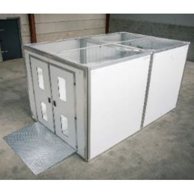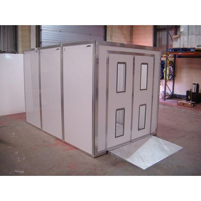 The 2 Stage Material Lock Design is a robust composite panel construction, 6mm thick with white powder coated aluminium skin on both sides with polymer core containing a quality aluminium roof and floor sections with transparent centre section on roof. Galvanised steel SUB floor sections. Easily fitted together. Allows pallets to be pushed through on pump truck for washing/decontamination.