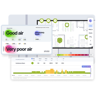 Airvoice.Indoor provides actionable air quality insights at a building, floor, room, or sensor level in real timeProperty owners and businesses can use Airvoice.Indoor to effectively manage their ventilation and air filtration systems, ensuring safe and healthy indoor environments. The platform provides clear visualization of air parameters that can be shared with tenants, employees, and investors through a website, mobile app, and public displays. With a reliable continuous air quality monitoring system in place, buildings and corporations can drive value for occupants and earn credits for green/healthy building certifications.